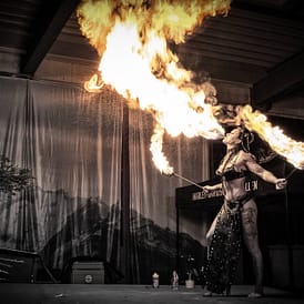 Elementen wie Feuer, Akrobatik/ Artistik und nach Bedarf auch einer Schlange setzt Sie ihre faszinierenden Kostüme,